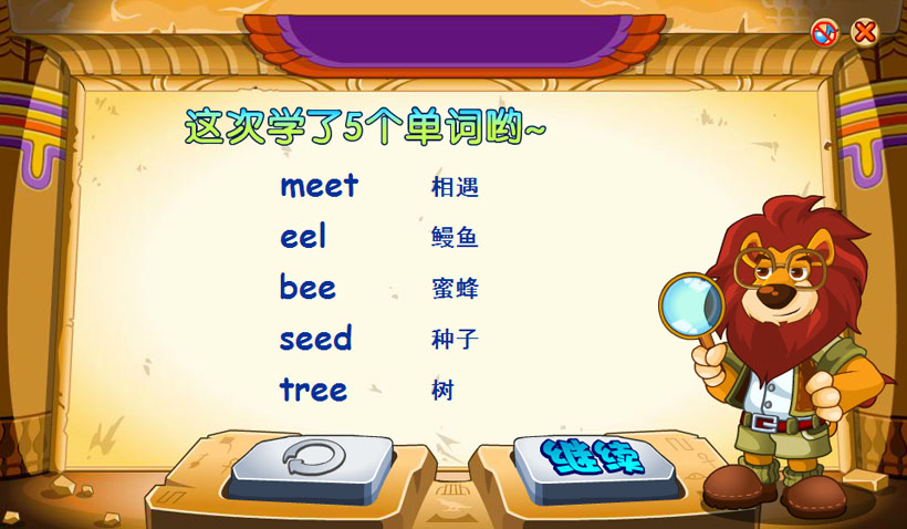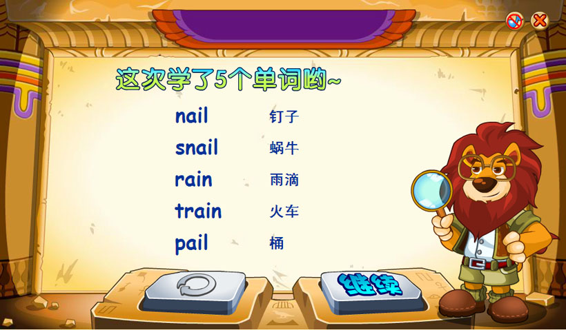 每组发音练习包括五个单词,每个单词的训练包括字母组合的朗读和单词的朗读,在第一遍朗读之后,狮子老师会要求小朋友们跟着他一起朗读。如果小朋友们没有听清楚,点击下面的按钮,就可以再听一遍。为了强化小朋友们的记忆,每个单词练习两遍之后,小朋友们才可以进行下一个练习哦!