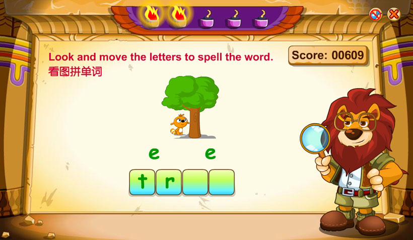 在练习部分,每个单词将会被拆开,并打乱字母的顺序,小朋友们需要根据图片的含义,通过用鼠标拖拽字母来拼写单词。拼写正确,狮子老师会朗读单词,并进行下一个练习。如果拼写错误,将不能进行下一个练习,直到拼写正确为止。完成全部练习,就会拿到奖励啦!