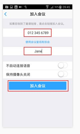输入房间号和孩子的名字,按【加入会议】按钮即可进入教室。其他设置保持默认(如图所示)