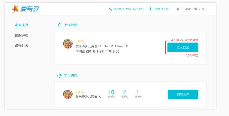 上课时,登陆http://www.aizhuanjiao.com,看准上课时间,点击本节课的【进入教室】按钮