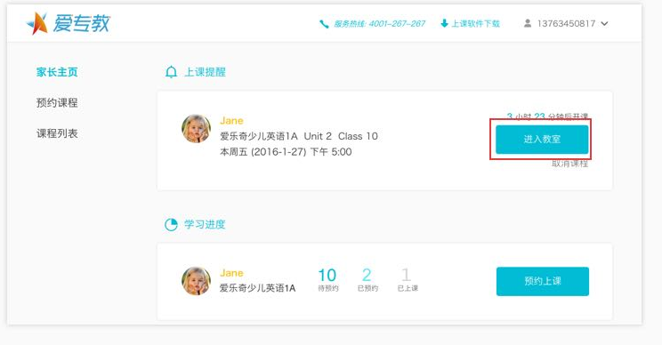 上课时,登陆http://www.aizhuanjiao.com,看准上课时间,点击本节课的【进入教室】按钮